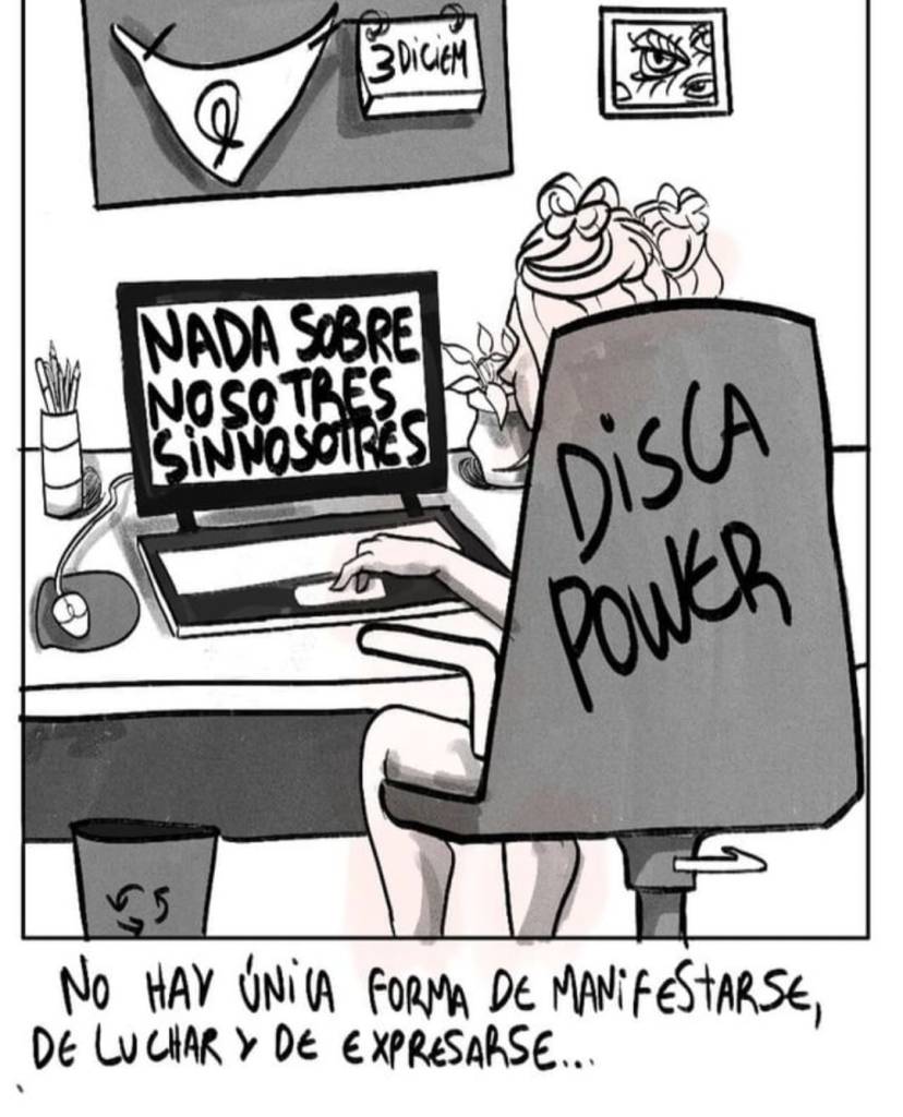 Descripción de la imagen: Ilustración en Blanco y negro. Una mujer de espaldas en su escritorio donde está su computadora que en su pantalla dice «Nada de Nosotros sin Nosotros», en su pared tiene colgado una bandera y un cartel que dice 3deDiciembre, en el espaldar de su silla dice «Disca Power». Al finalizar la Ilustración dice «No hay única forma de manifestarse,de luchar y expresarse»